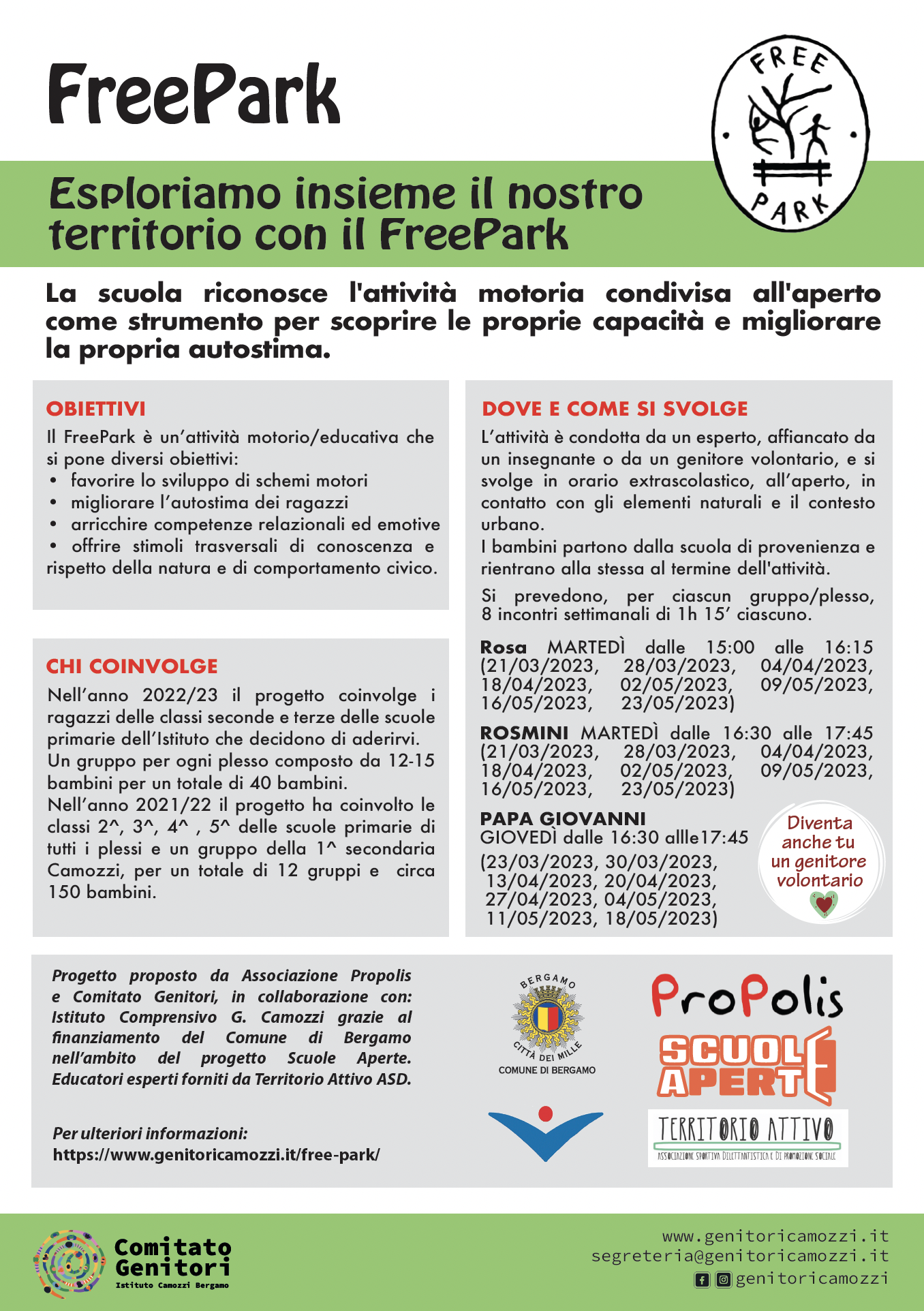 Eventuali disponibilità per i futuri anni potranno essere comunicate a segreteria@genitoricamozzi.it o mettendosi in contatto coi i genitori referenti di plesso per il progetto. I genitori volontari, unitamente ai docenti di riferimento, riceveranno una breve ma indispensabile formazione, della durata di circa un’ora, da parte degli educatori di Territorio Attivo ASD, prima dell’inizio delle attività.
